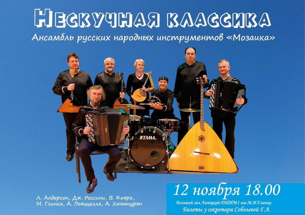 12 ноября наша школа стала по-настоящему музыкальным пространством. К нам с концертной программой «Нескучная классика» приехал замечательный ансамбль народных инструментов «Мозаика» из Липецкой государственной филармонии.