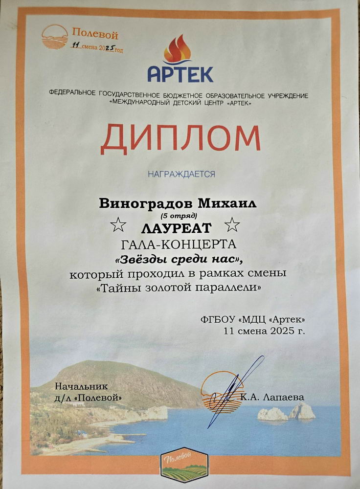 Завершилась поездка нашего молодого музыканта Михаила Виноградова в международный детский центр «Артек». Эта поездка стала возможной благодаря его музыкальным достижениям и упорным занятиям на фортепиано, любовь к музыке, усердным занятиям и победах в конкурсах!