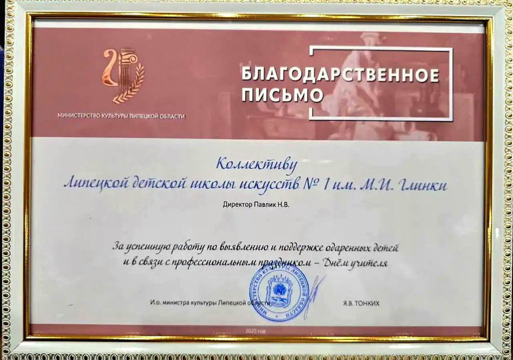 Благодарность коллективу нашей школы стала достойным признанием значительных усилий преподавателей и заметного вклада учебного заведения в формирование культурного облика региона, ведь Липецкая детская школа искусств №1 имени М.И. Глинки️ — это настоящее волшебное пространство, где под руководством опытных педагогов раскрывается творческий потенциал каждого ребёнка.