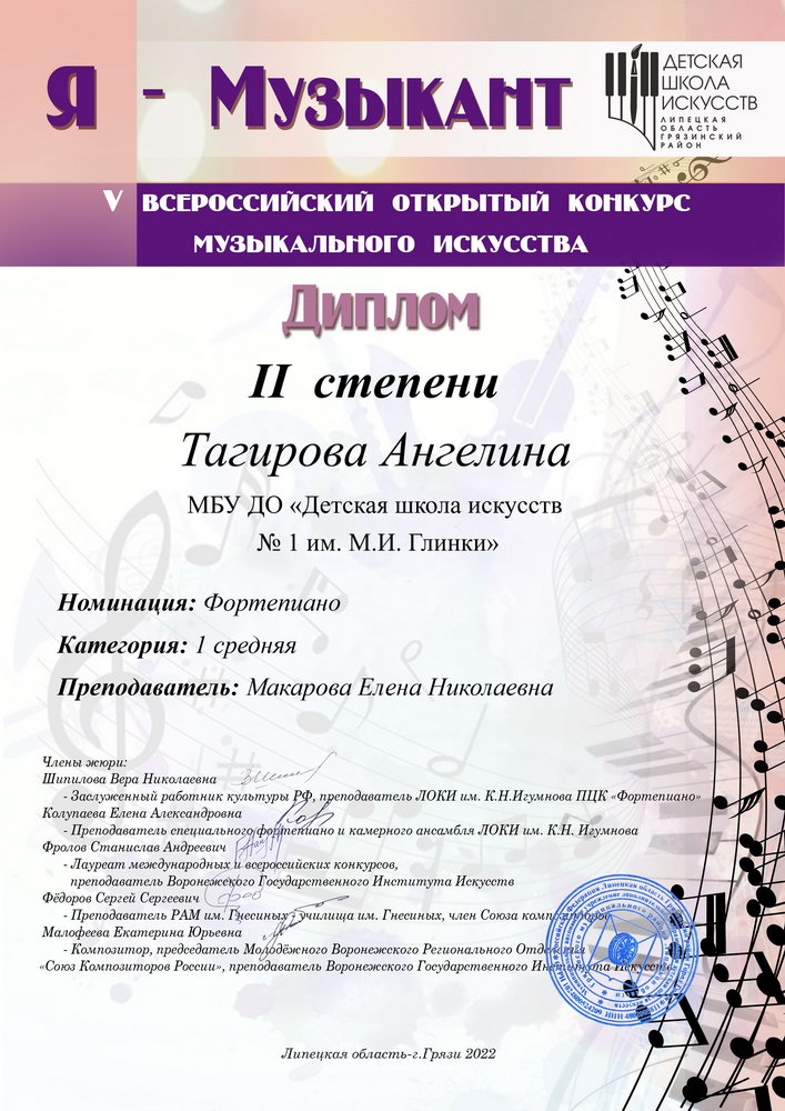 - Поздравляем победителей! IV Межрегионального конкурса музыкального и вокального искусства "Я - музыкант!" Дипломанты: Тагирова Ангелина (преп. Макарова Е.Н.) - Дипломант III ...