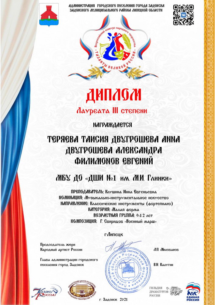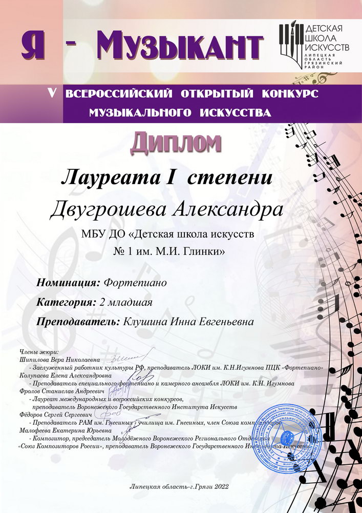 - Заочный тур VII Всероссийского открытого конкурса музыкального искусства "Я музыкант" г.Грязи. Поздравляем учащихся фортепианного отделения с блестящими результатами: Двугрошева ...