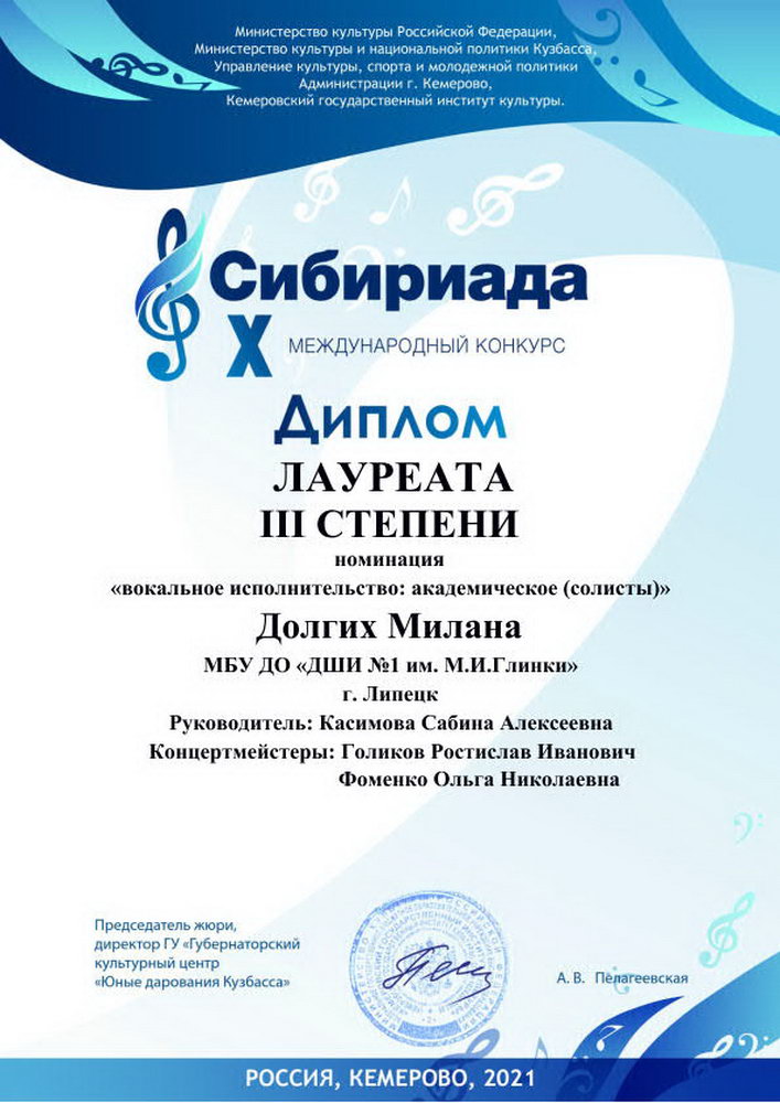 - ... Федор - Лауреат 1 степени Галкина София - Лауреат 2 степени Преп. Касимова Сабина Алексеевна Конц. Устиновская Ольга Геннадьевна Долгих Милана - Дипломант 1 степени Преп. Касимова ...