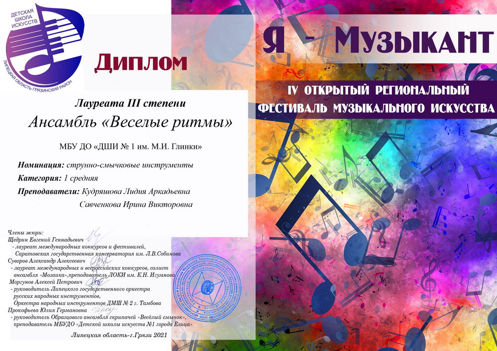 - ... результатами: Образцовый ансамбль скрипачей "Калейдоскоп " Лауреат 1 степени (преподаватель Савченкова И.В., концертмейстер Трофимова Е.А.) Ансамбль скрипачей "Весёлые ритмы" Лауреат 3 степени ( ...