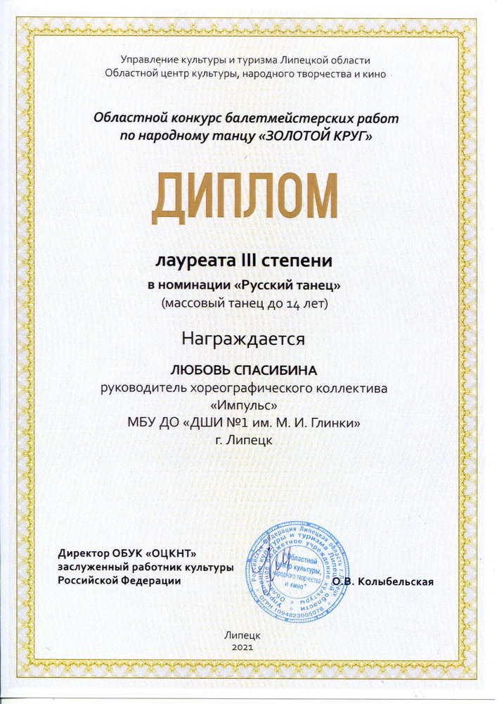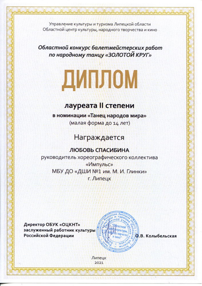 - ... достижения. Образцовый хореографический коллектив "Импульс", руководитель Спасибина Л.Н. Коллектив - дважды Лауреат 2 степени Дуэт Савельев Владислав, Вострикова Ева- Лауреат 2 степени ...