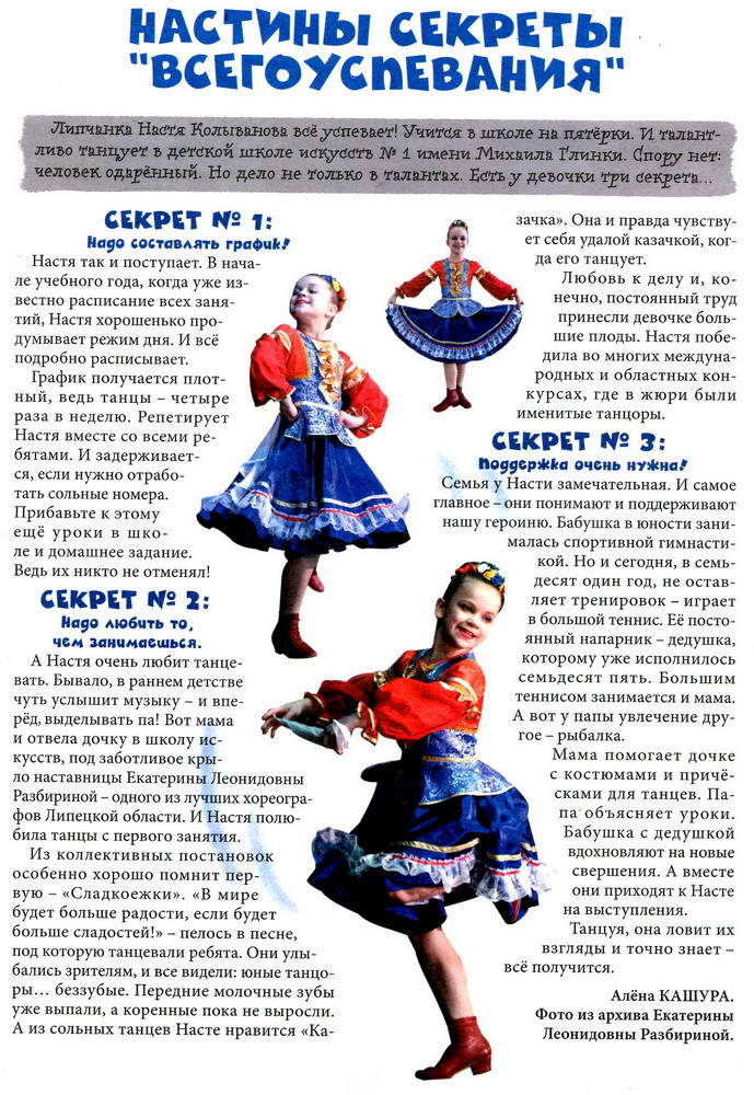 Выступление Колывановой Насти на концертах неизменно вызывает восхищение зрителей, а на конкурсах - заслуженные похвалы членов жюри и высокие результаты. Настя является стипендиатом администрации Липецкой области. А еще она отлично учится в общеобразовательной школе. Своими секретами "всегоуспевания" Настя поделилась с читателями Липецкой областной детской газеты "Золотой ключик" (№19 от 14.09.2021 года).