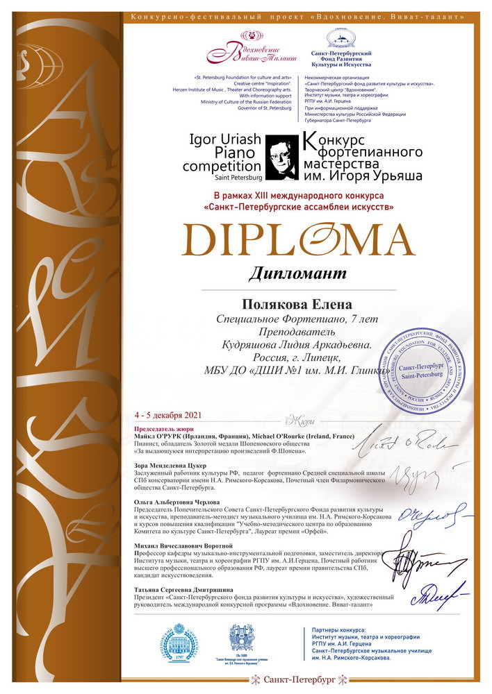 В Период С 3-6 Декабря 2021 Года, в Санкт-Петербурге В Рамках XIII Международного Конкурса–Фестиваля «Санкт-Петербургские Ассамблеи Искусств» Прошел VIII Международный Конкурс Фортепианного Мастерства Имени Игоря Урьяша.