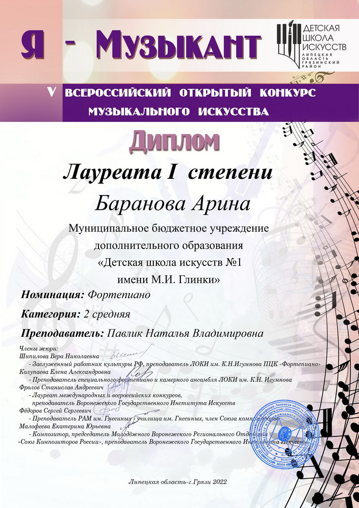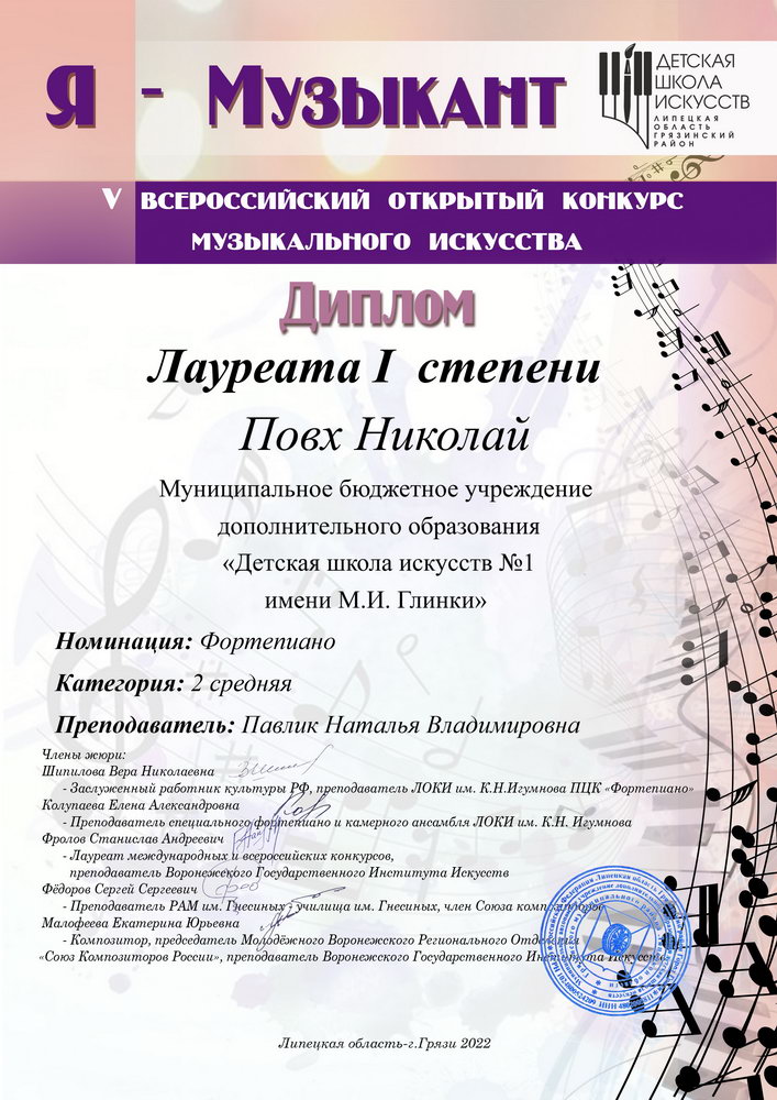 Поздравляем учащихся фортепианного отделения и педагога Павлик Н.В. с победой в V Всероссийском открытом конкурсе музыкального искусства «Я музыкант»!.