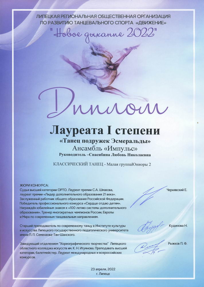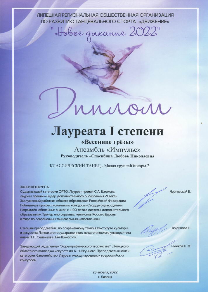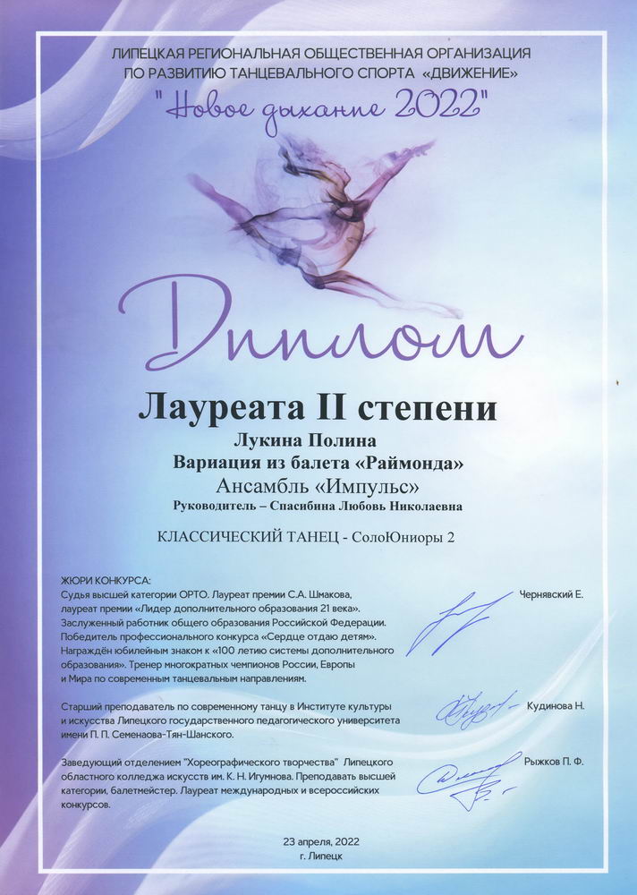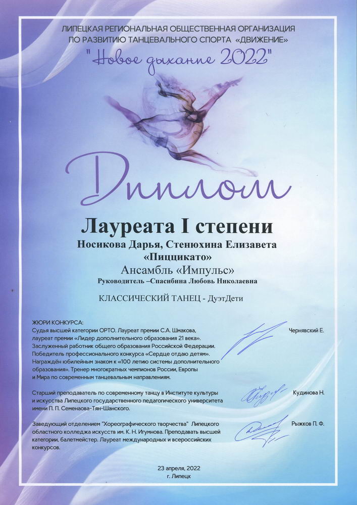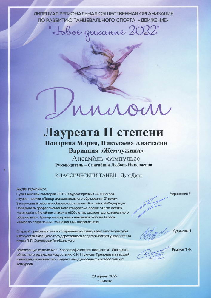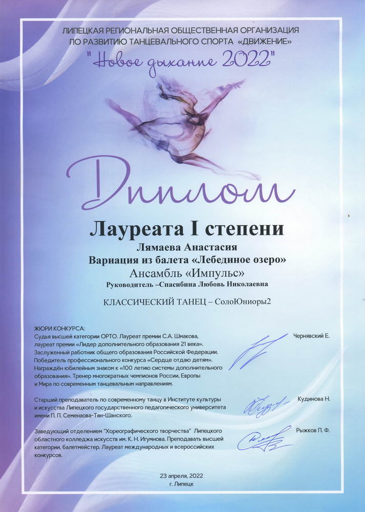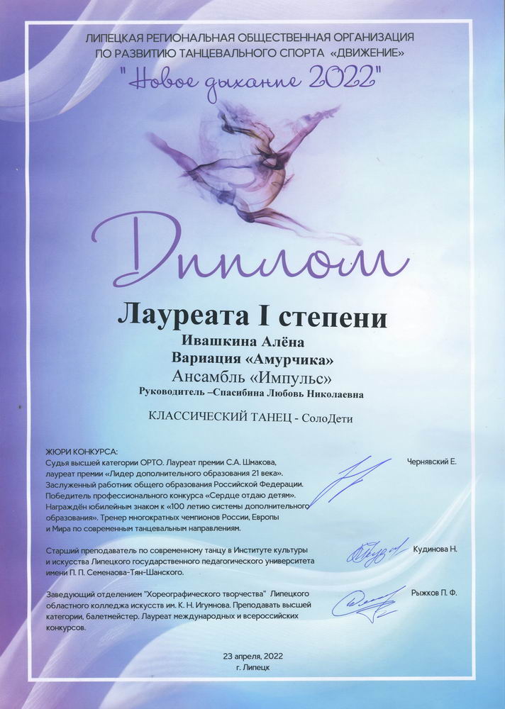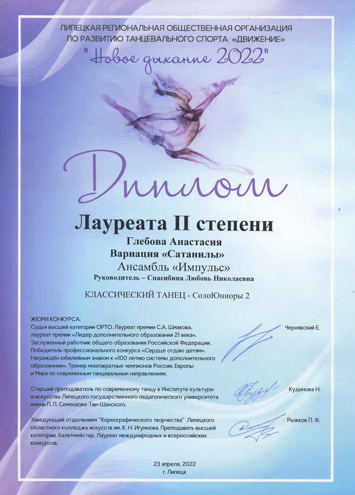 23 апреля в Липецке прошел Международный фестиваль-конкурс «Новое дыхание». В нем приняли участие педагоги хореографического отделения Спасибина Г.Ю. и Спасибина Л.Н. со своими учащимися. В различных номинациях, таких как соло, дуэты и коллективы ученики нашей школы завоевали в общей сложности 9 лауреатов I степени, 7 лауреатов II степени! Поздравляем с победой!