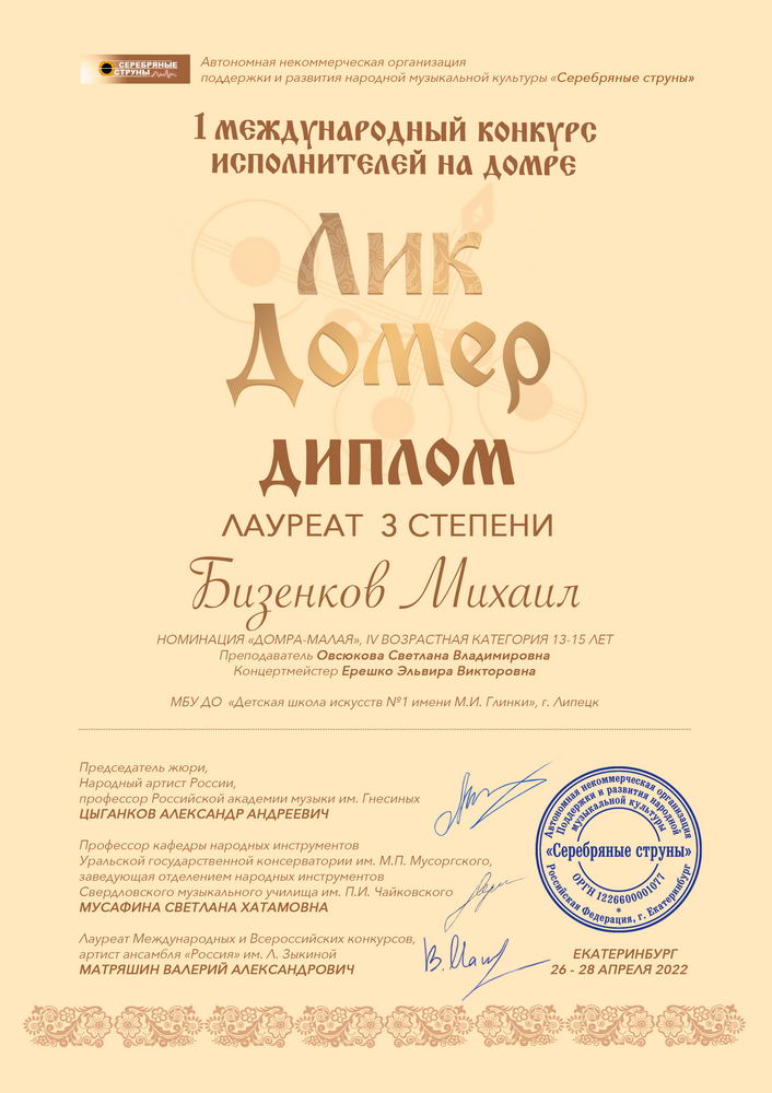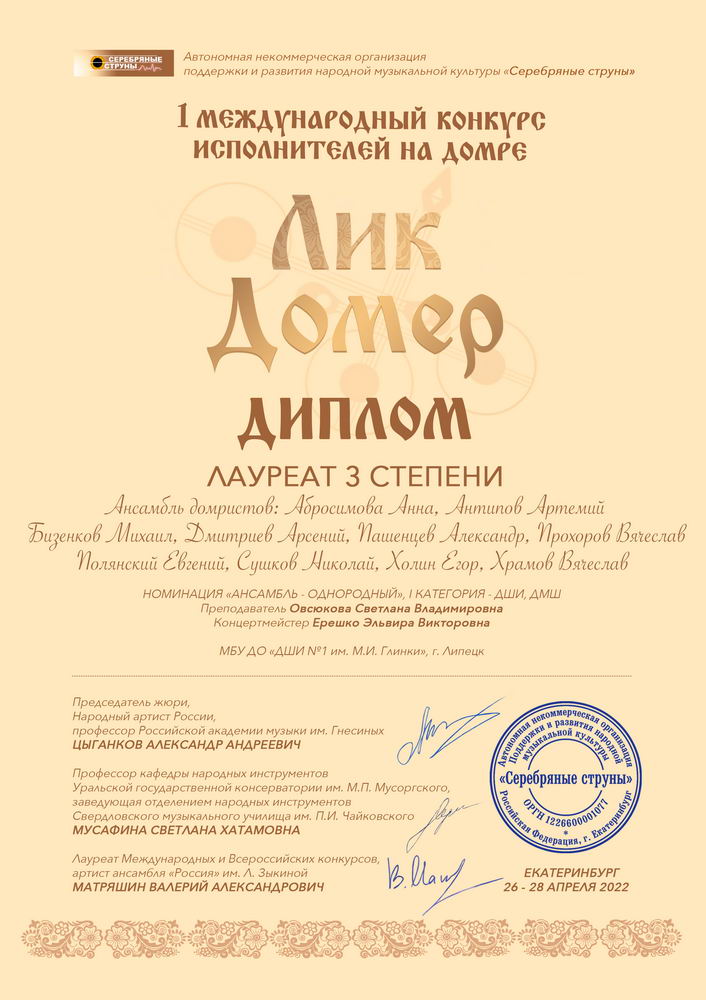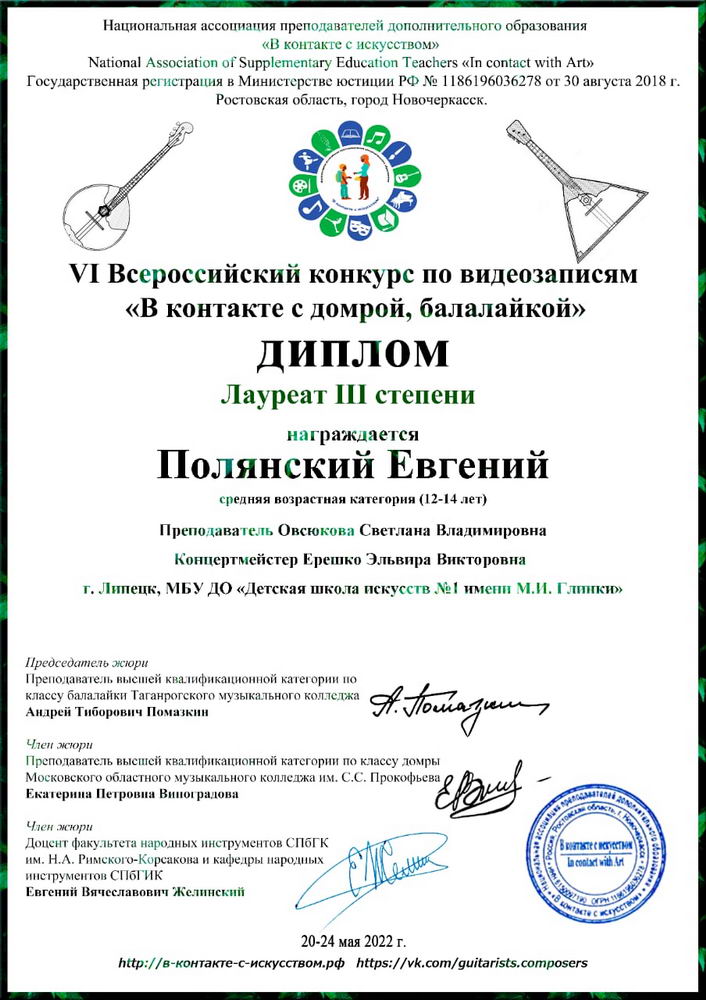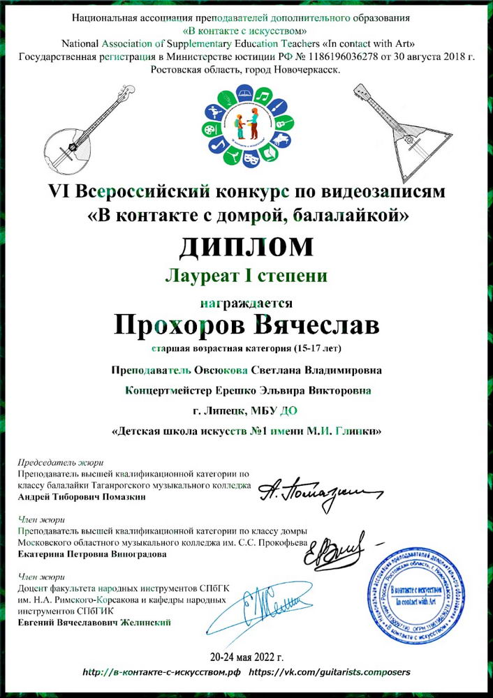 Поздравляем учеников Овсюковой Светланы Владимировны с победой во Всероссийском конкурсе по видеозаписям «В контакте с домрой, балалайкой» и Международном конкурсе исполнителей на домре «Лик Домер»!