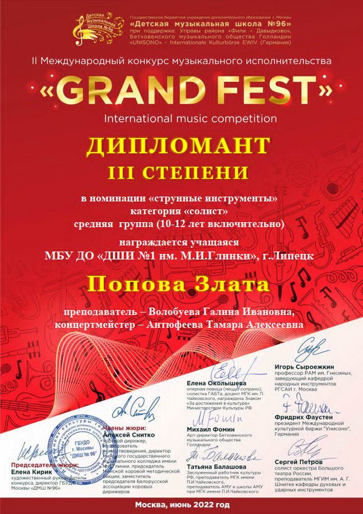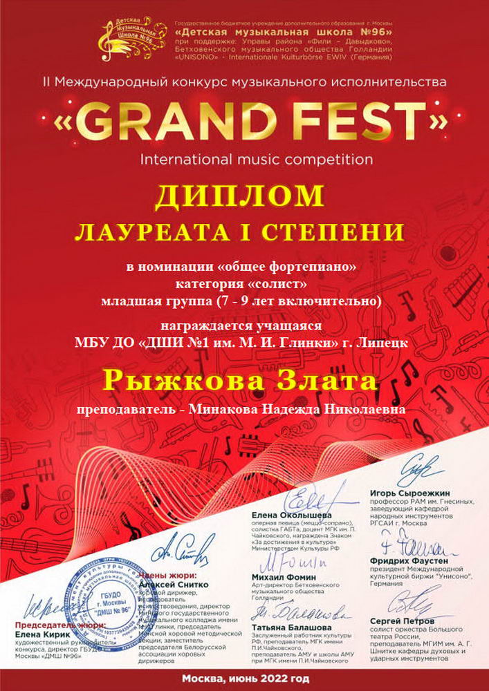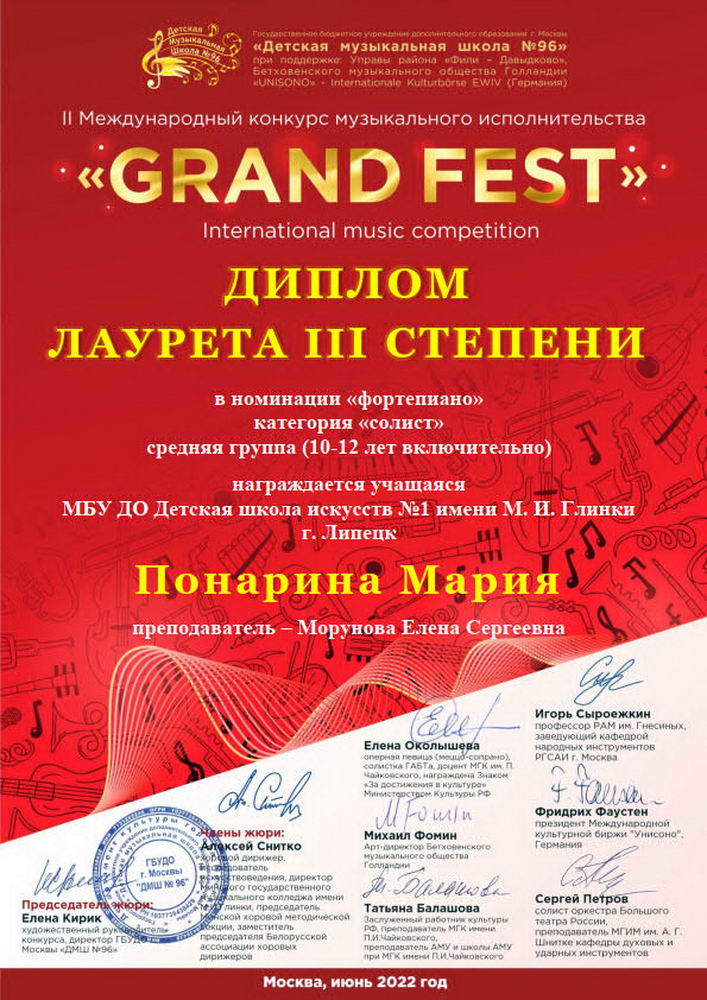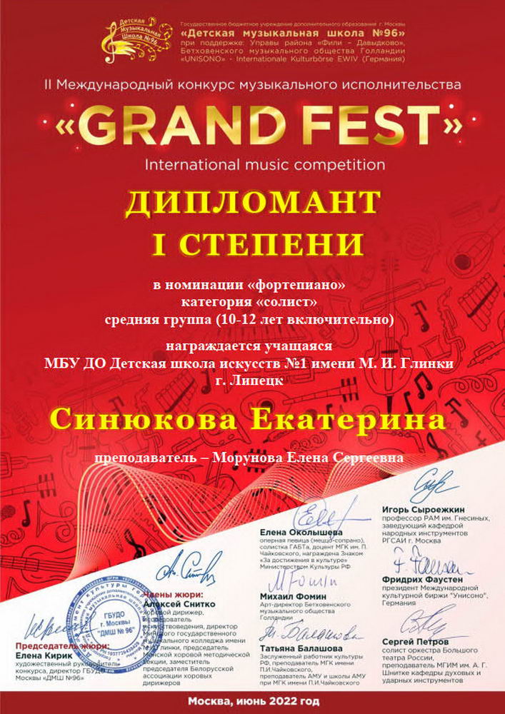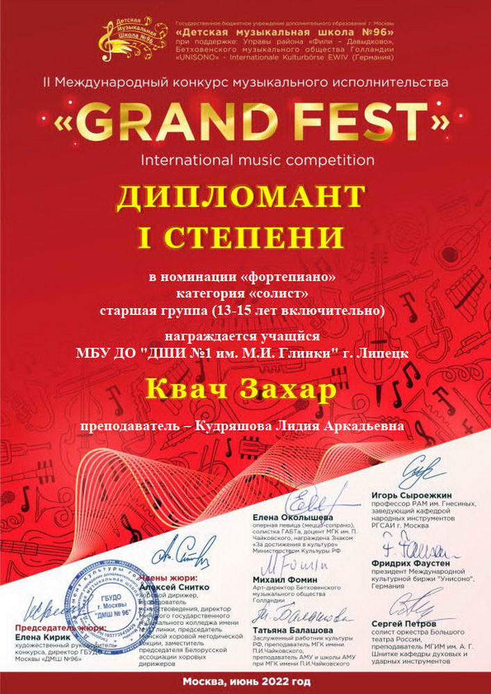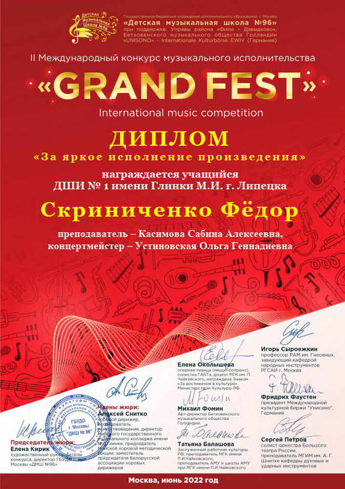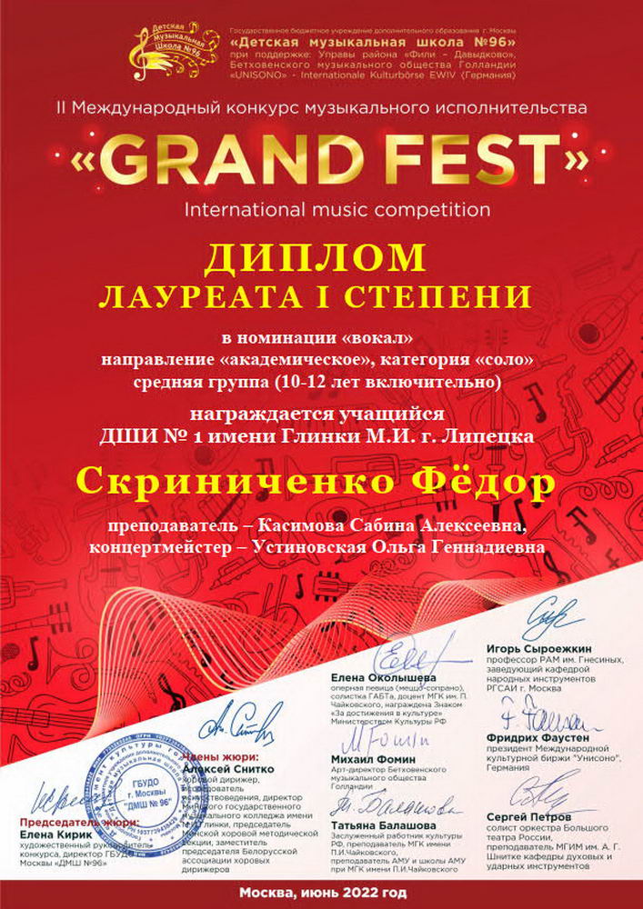 В период летних каникул наши учащиеся и педагоги не сидят без дела. В июне в Москве прошел II Международный конкурс музыкального исполнительства «Grand Fest», организованный Департаментом культуры г.Москвы и детской музыкальной школой №96 г.Москвы. Результаты не заставили себя долго ждать. Поздравляем Касимову С.А., Морунову Е.С., Кудряшову Л.А., Волобуеву Г.И., Минакову Н.Н. и их учащихся с победой! Особенные поздравления Скриниченко Федору, он был удостоен специального диплома «За яркое исполнение произведений»! Поздравляем!