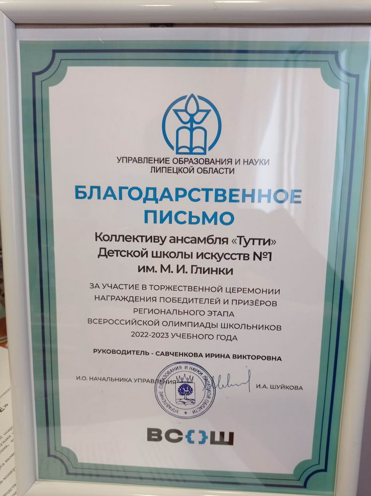 16 марта в зале Администрации Липецкой области прошла торжественная церемония награждения победителей и призеров регионального этапа Всероссийской олимпиады школьников, где ансамбль струнно-смычкового отделения «Тутти» (класс преподавателя Савченковой И.В., концертмейстер Попова Г.В.) подарил зрителям свой творческий подарок.