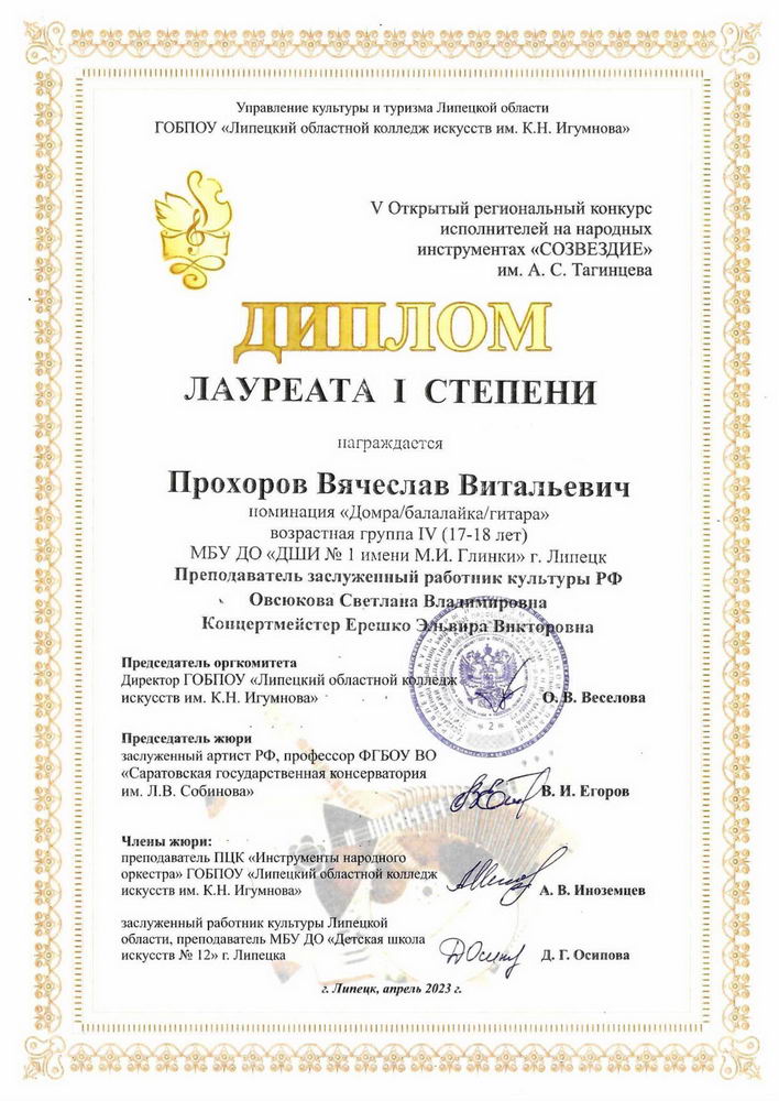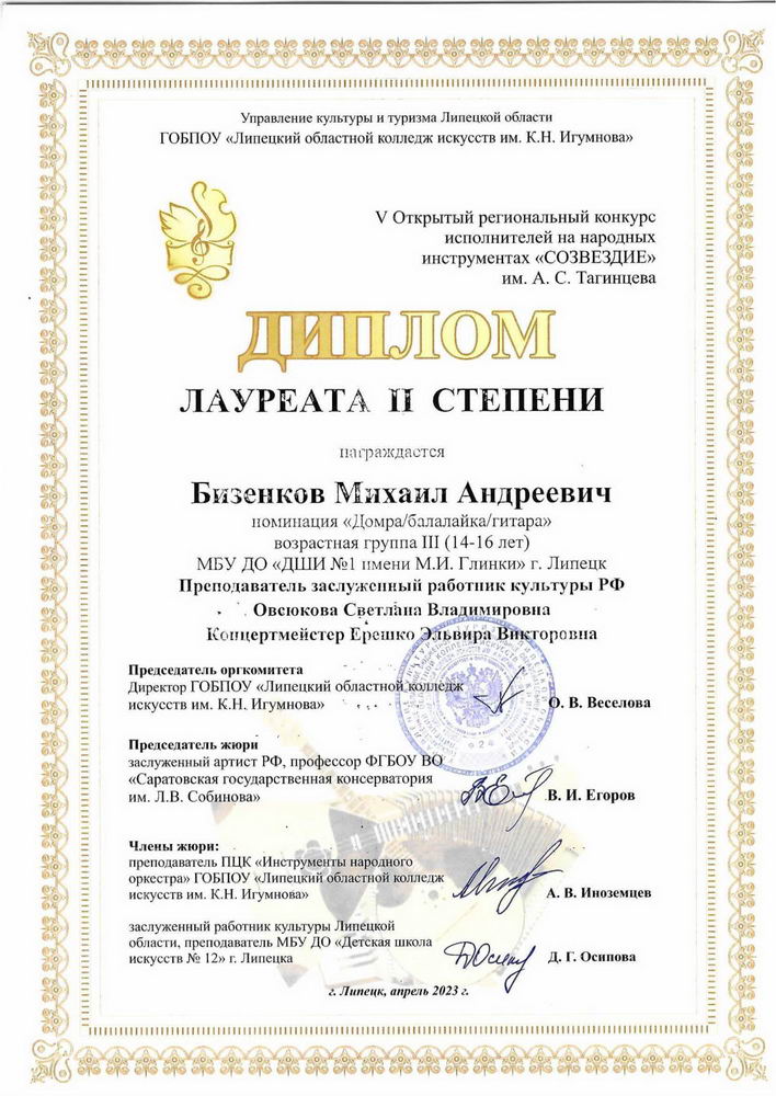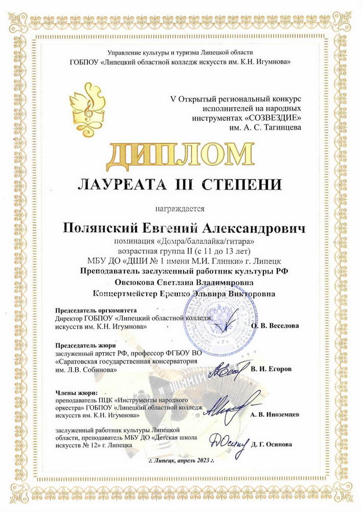 2 апреля в Липецком областном колледже искусств прошел V Открытый региональный конкурс исполнителей на народных инструментах "Созвездие" им А.С.Тагинцева. В творческом противостоянии учащиеся нашей школы завоевали призовые места: