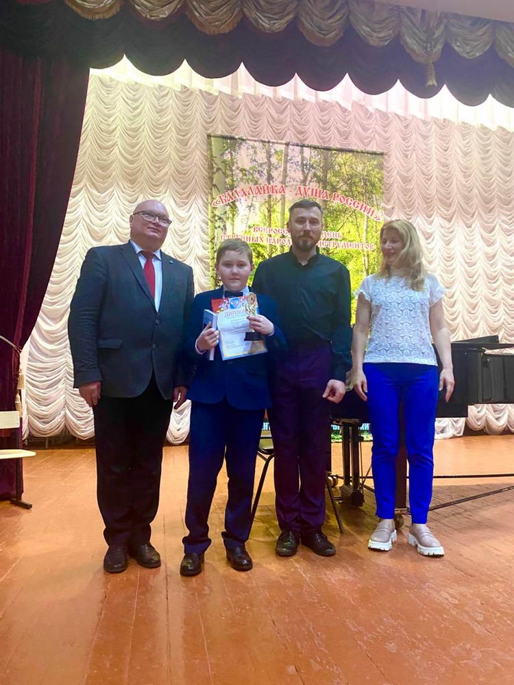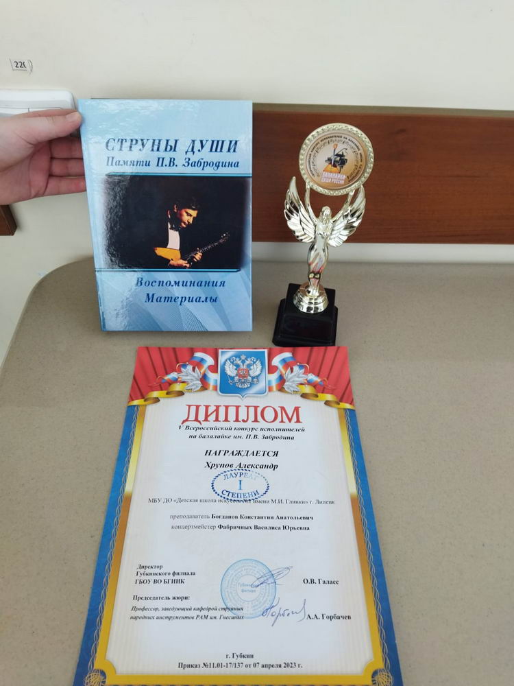 Наш балалаечник, Хрупов Александр, учащийся 5 класса преподавателя Константина Анатольевича Богданова стал победителем: лауреатом 1 степени в 5 Всероссийском конкурсе исполнителей на балалайке им. П.В. Забродина. Конкурс проходил 7 апреля в г.Губкине (Белгородская обл.) в филиале Белгородского государственного института искусств и культуры.