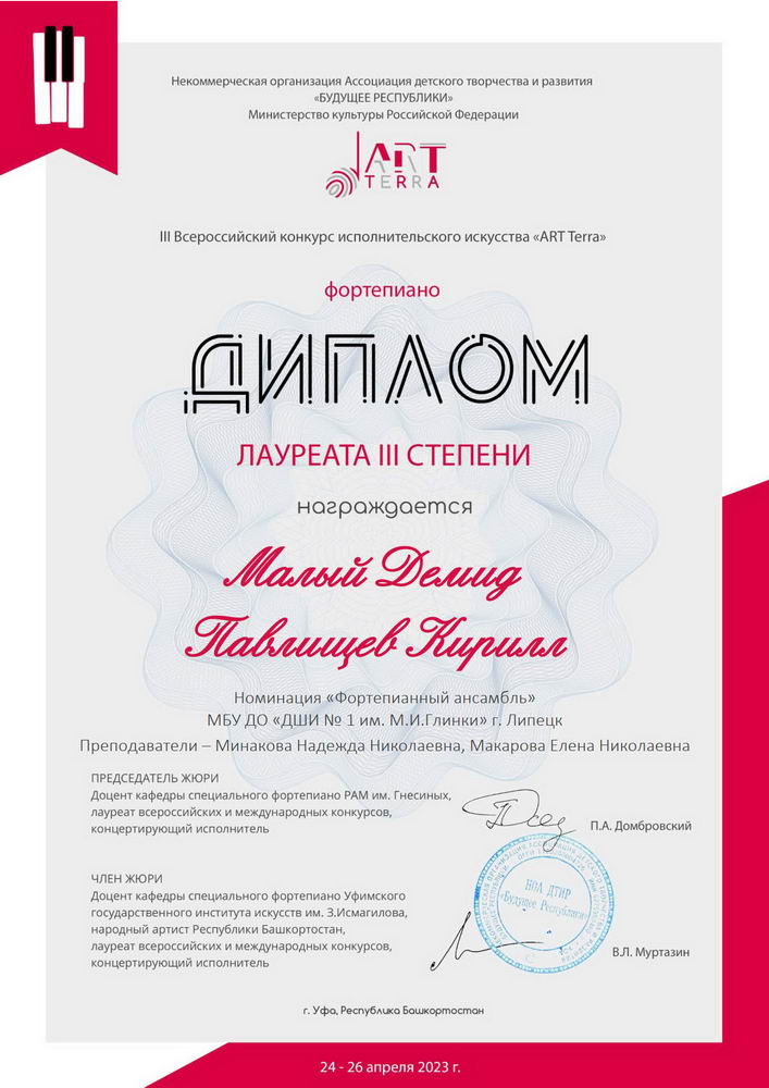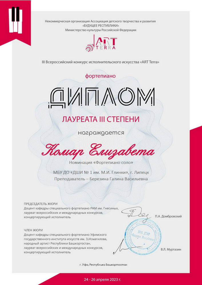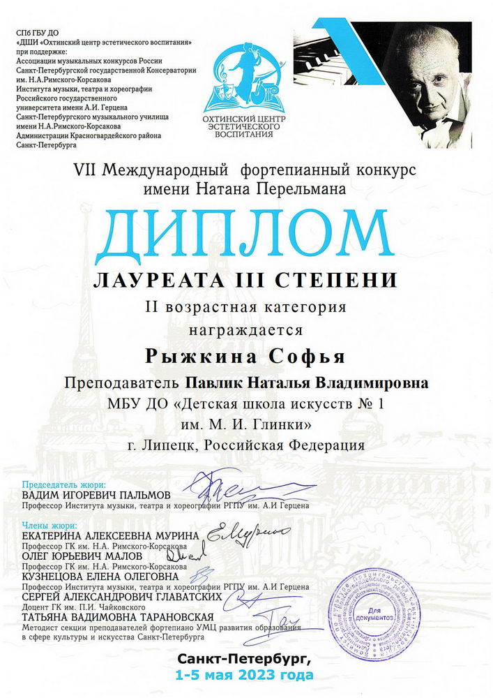 Поздравляем учащихся фортепианного отделения, а также педагогов Павлик Н.В., Фарба Е.Е., Березину Г.В., Минакову Н.Н., Макарову Е.Н. с достойным выступлением на конкурсах. Отдельно хочется поздравить Рыжкину Софью с победой на VII Международном фортепианном конкурсе имени Натана Перельмана в Санкт-Петербурге!