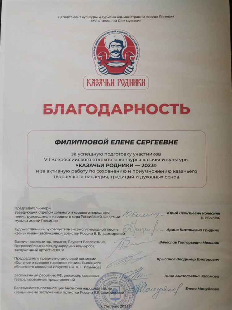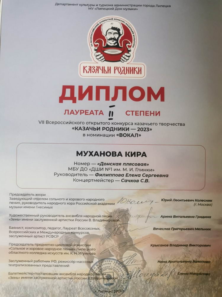 Так же поздравляем Филиппову Е.С. и её ученицу Муханову Киру с прекрасным выступлением на VII Всероссийском открытом конкурсе казачьей культуры "Казачьи родники-2023". Кира стала Лауреатом 2 степени за номер "Донская плясовая".