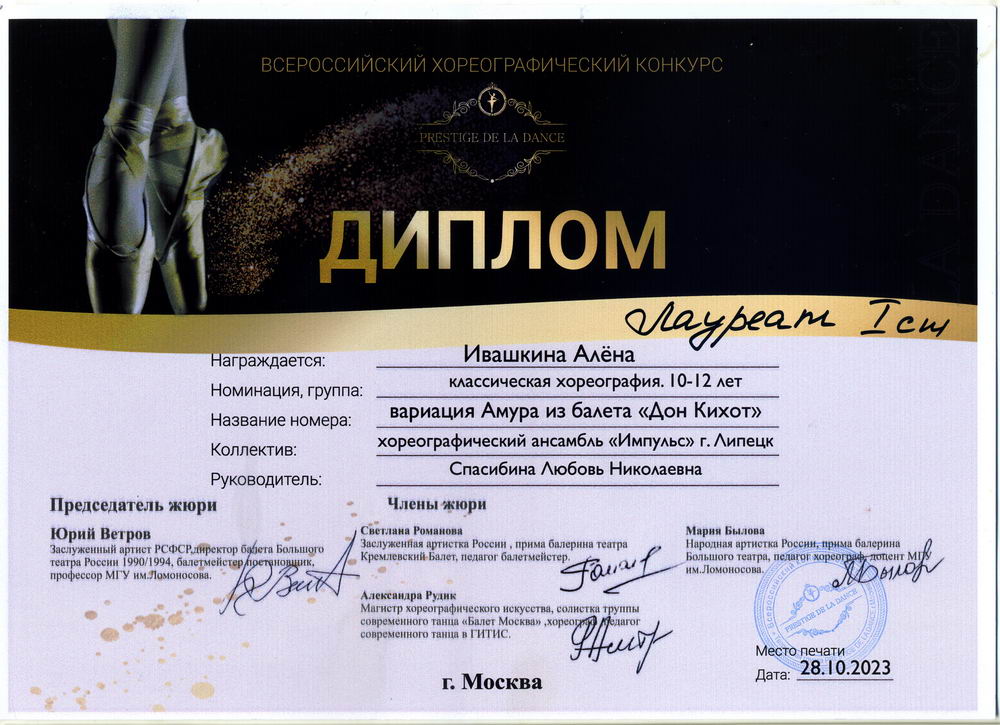 28 октября в г. Москва прошел Всероссийский хореографический конкурс «PRESTIGE DE LA DANCE», в котором приняла участие ученица 7 класса хореографического отделения Ивашкина Алена (преподаватель Спасибина Л.Н.).