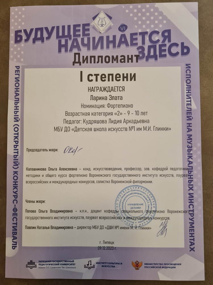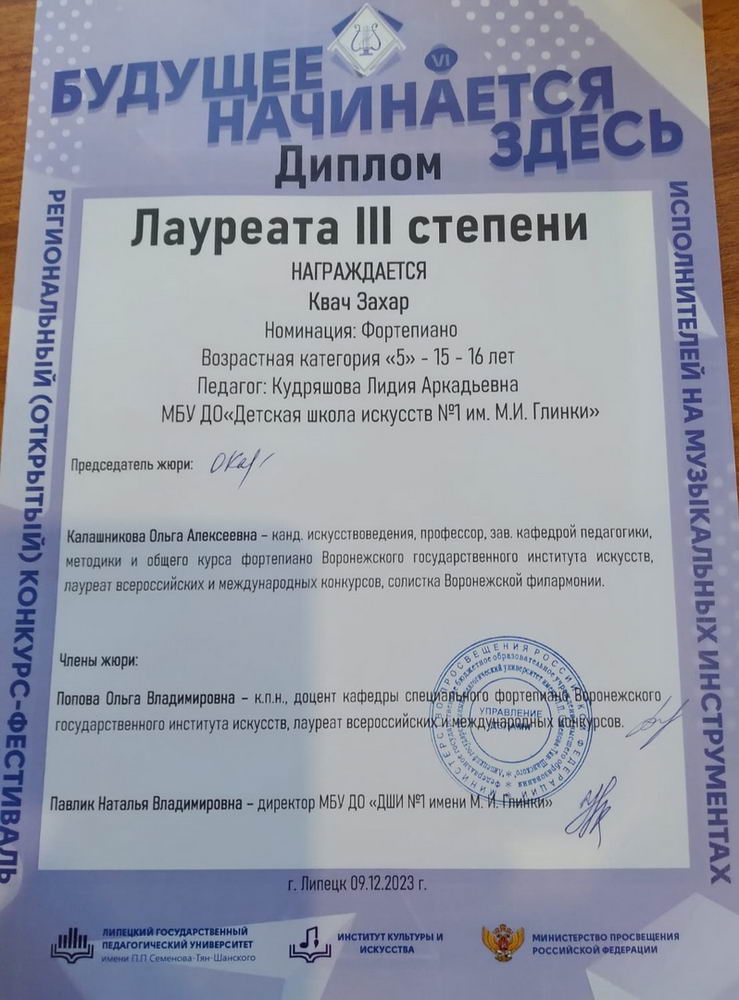- Лауреат 3 степени - Кретова Елизавета (преп . Савченкова И.В., конц. Трофимова Е.А.)