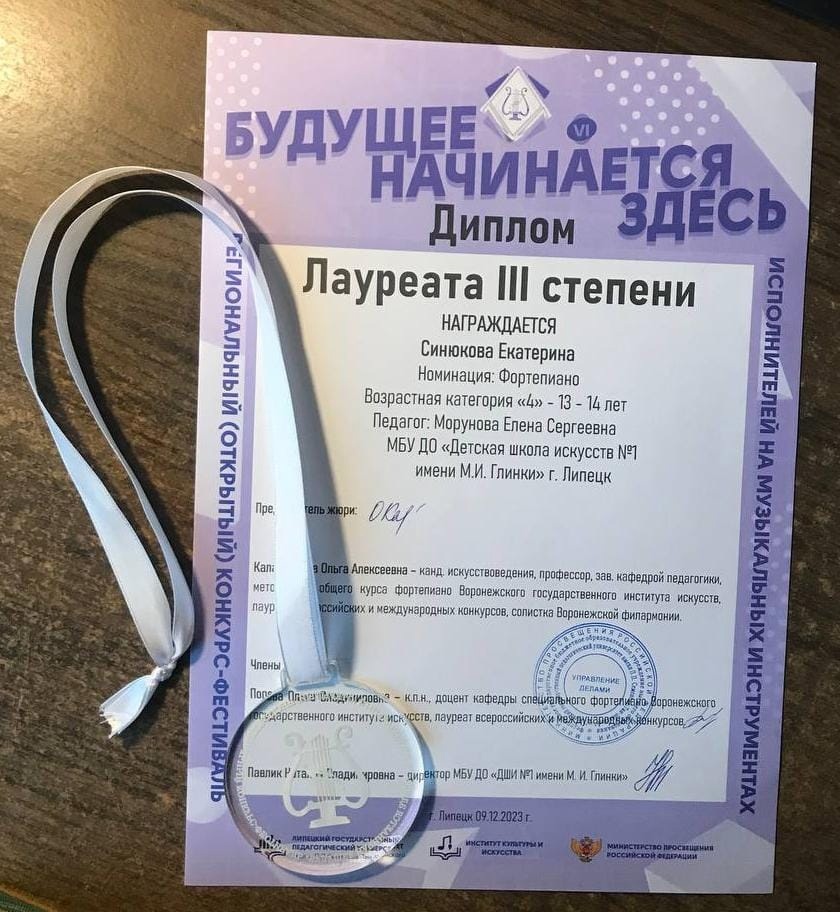 - Лауреат 3 степени - Синюкова Екатерина (преп. Морунова Е.С.)