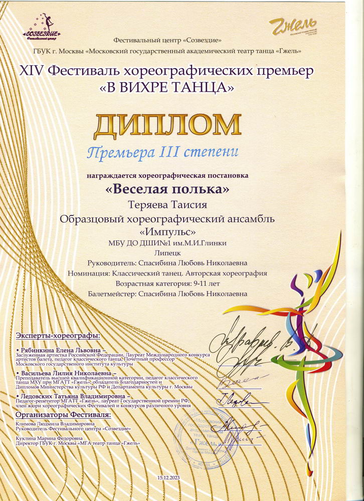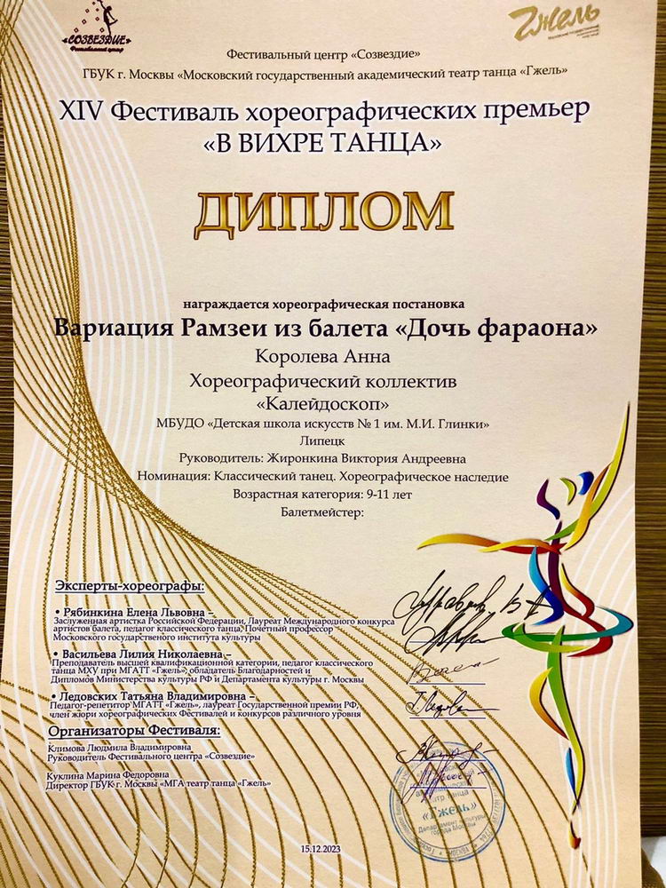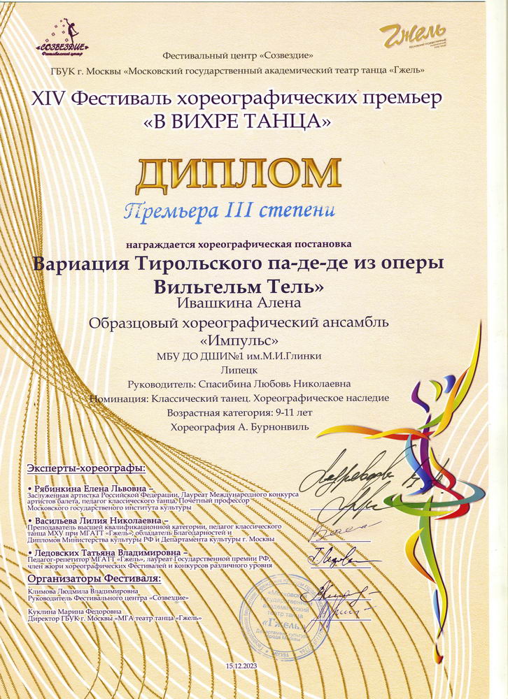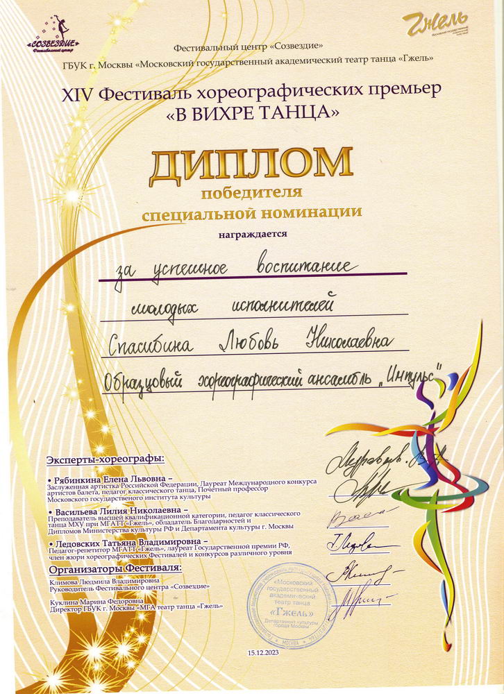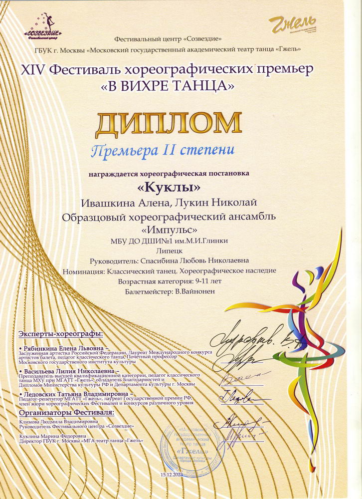 15 декабря в г. Москва состоялся 2 тур XIV Фестиваля хореографических премьер «В ВИХРЕ ТАНЦА». Конкурс проходит в два тура. Первый тур проходит онлайн по видеозаписям. Прошедшие во 2 тур были приглашены для участия в Москву.