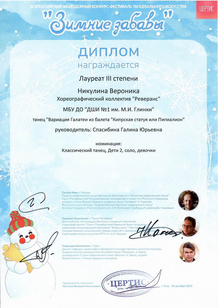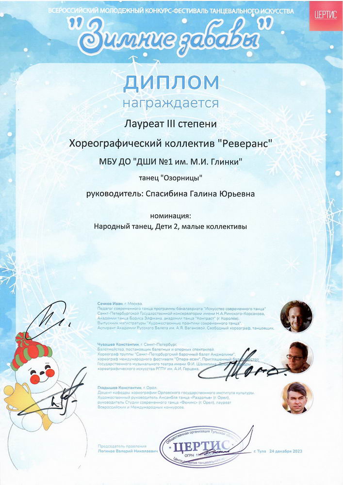 24 декабря хореографический коллектив «Реверанс» (руководитель Спасибина Г. Ю.) принял участие в Всероссийском молодежном конкурс-фестивале танцевального искусства «Зимние забавы»  и стал обладателем следующих наград: