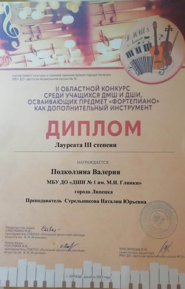 - Лауреат 3 степени - Подколзина Валерия (преподаватель Стрельникова Н.Ю.)