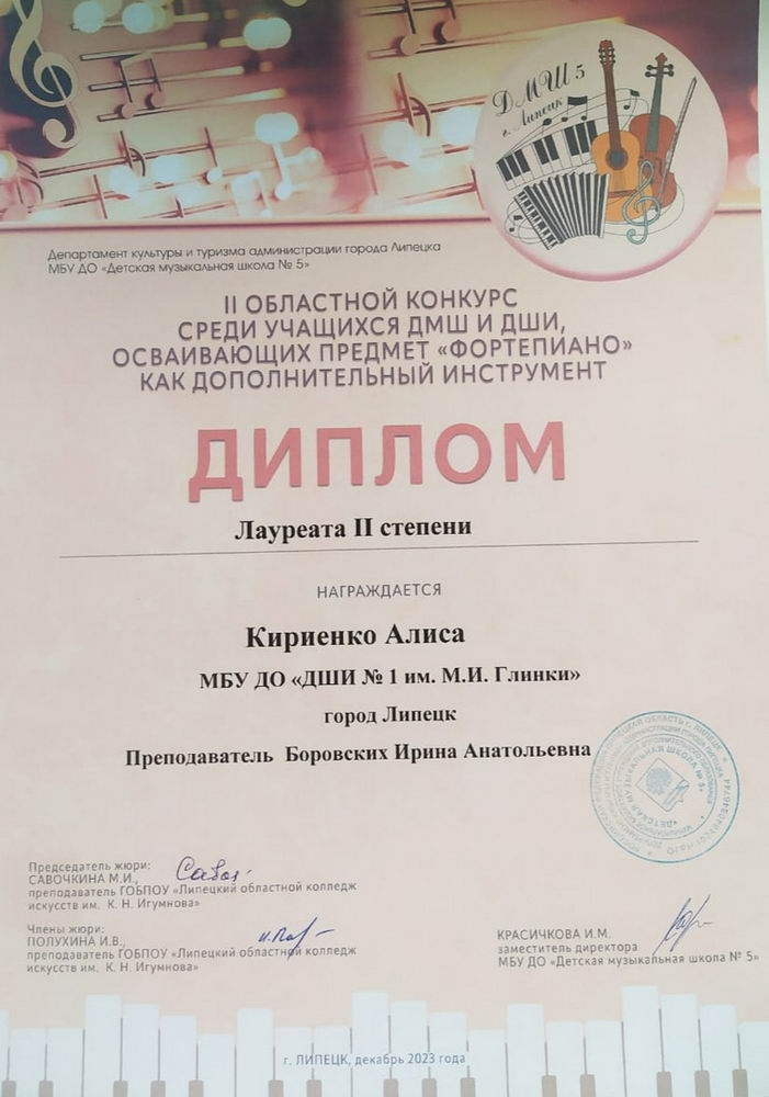 - Лауреат 2 степени - Кириенко Алиса (преподаватель Боровских И.А.)