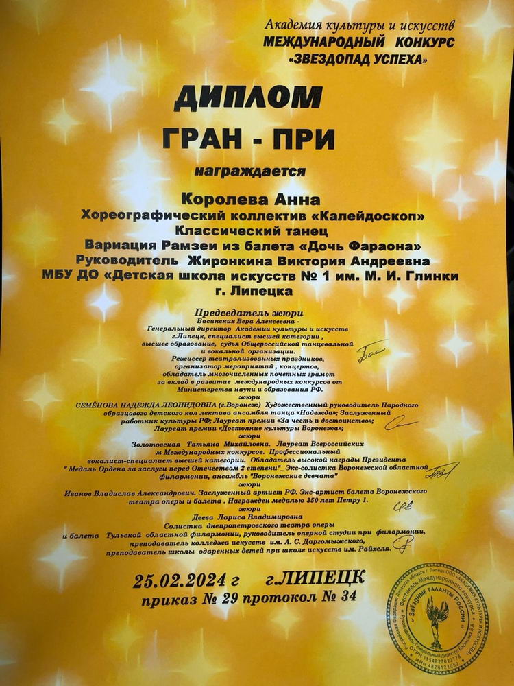 Поздравляем с победой на Международном многожанровом конкурсе «ЗВЕЗДОПАД УСПЕХА» 25 февраля 2024 г. Липецк.