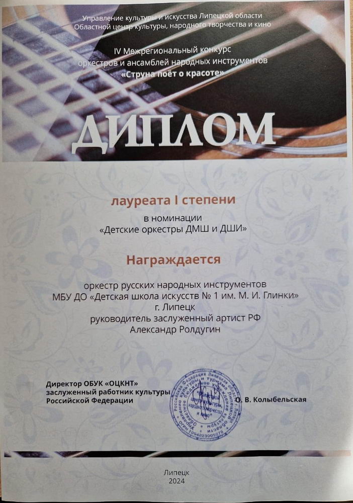 Коллектив нашей школы - Оркестр русских народных инструментов под руководством Ролдугина А. Г. стал Лауреатом 1 степени.