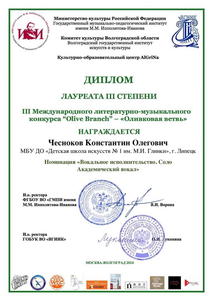 Поздравляем Чеснокова Константина, ученика отделения "Сольное пение", с победой на III Международном литературно-музыкальном конкурсе "Olive Branch" - "Оливковая ветвь". В номинации "Академический вокал" Константин стал лауреатом 3 степени.