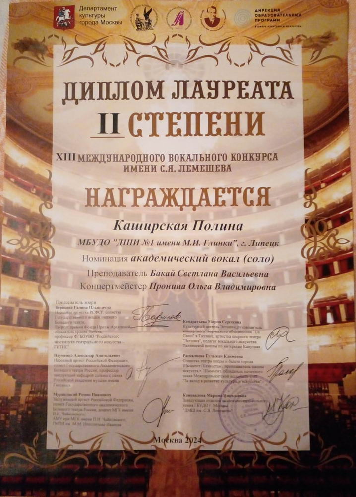 Со 2 по 8 декабря в Москве проходил Международный вокальный конкурс им. С.Я.Лемешева, в котором приняли участие ученики отделения "Сольное пение" - Каширская Полина и Каширский Михаил (преподаватель Бакай С.В, концертмейстер Пронина О.В.) Около двухсот талантливых вокалистов Российской Федерации, дальнего и ближнего зарубежья приняли участие в конкурсе. В каждой возрастной категории состязались около сорока человек. По итогам конкурса Каширская Полина стала Лауреатом 2 степени, Каширский Михаил участник. Поздравляем ребят с отличными результатами в таком серьёзном конкурсе.