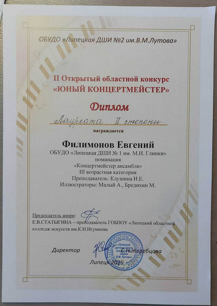 - Филимонов Евгений Лауреат 2 степени ( преподаватель Клушина И.Е. )