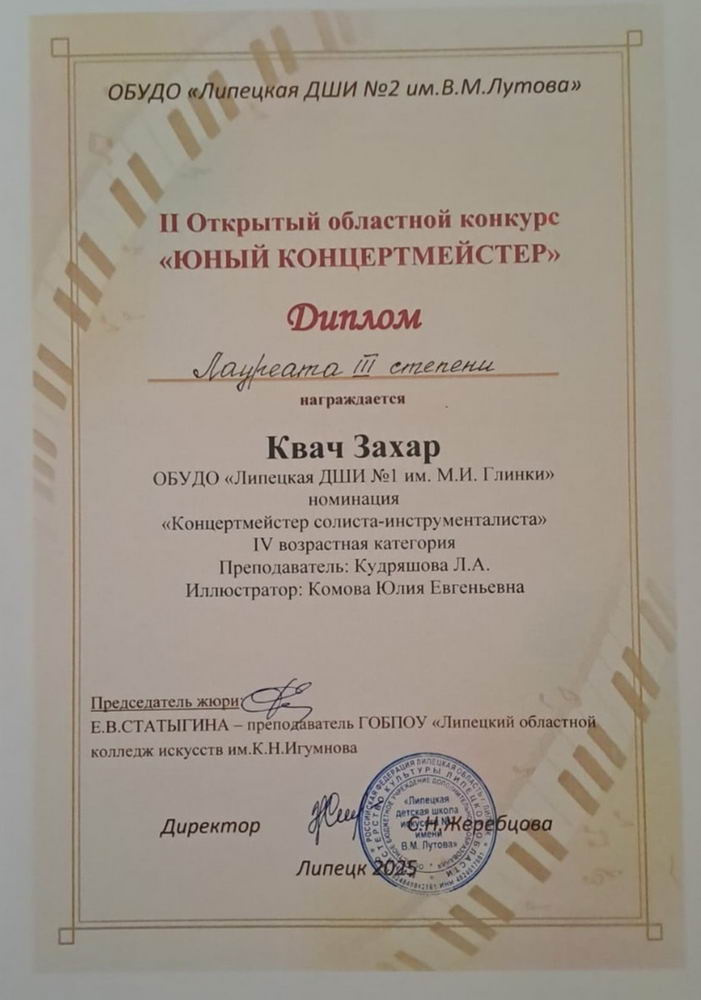- Квач Захар Лауреат 3 степени (преподаватель Кудряшова Л.А. )
