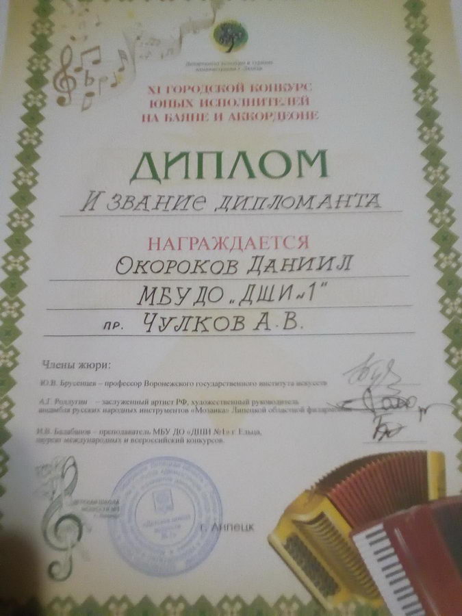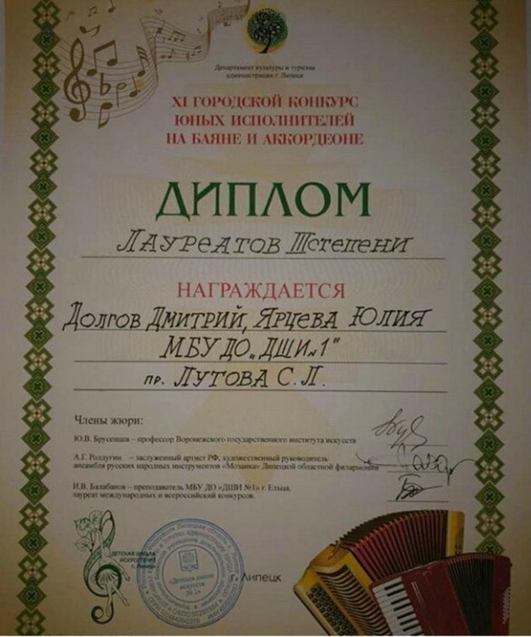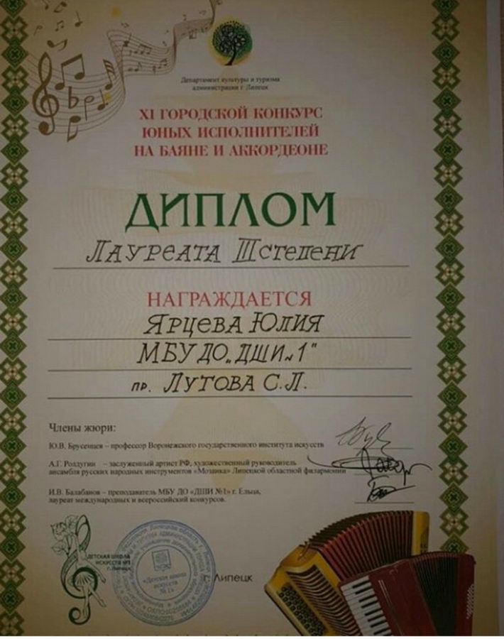 23 ноября 2019г состоялся XI городской конкурс юных исполнителей на баяне и аккордеоне в ДШИ №1. Конкурс проводился по направлениям "Солисты" и "Ансамбли". Участие преподавателя в составе ансамбля не допускалось. В состав оргкомитета вошли представители департамента культуры и туризма г.Липецка и ДШИ №1.