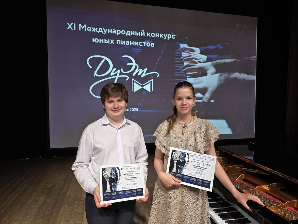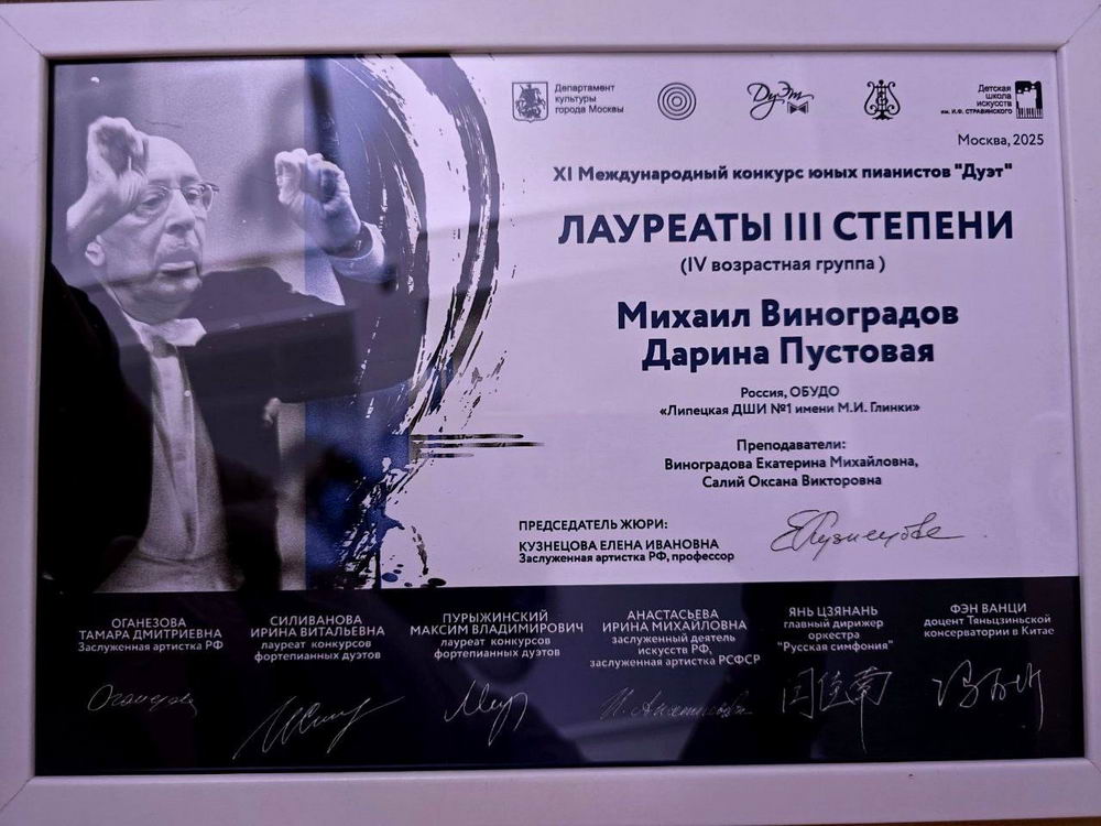 Дуэт Михаила Виноградова и Дарины Пустовой, учащихся Липецкой ДШИ №1 им. М.И. Глинки» (преподаватели Екатерина Виноградова и Оксана Салий) , завоевал звание лауреатов III степени.