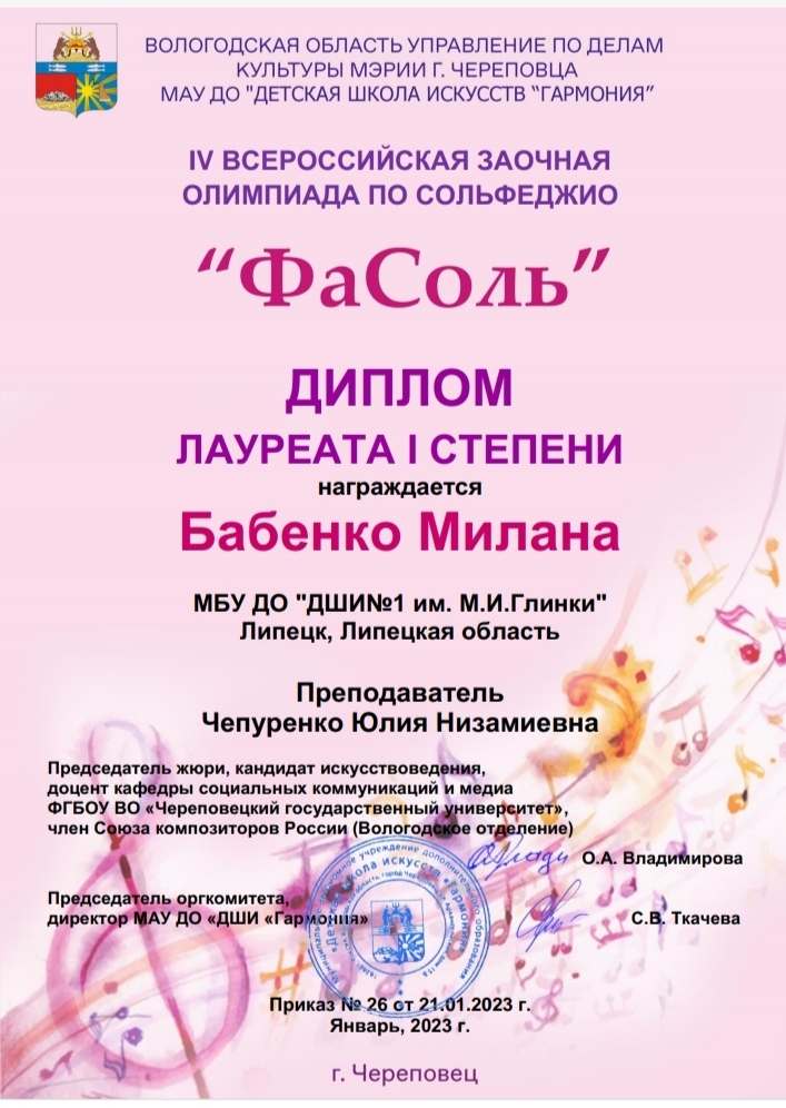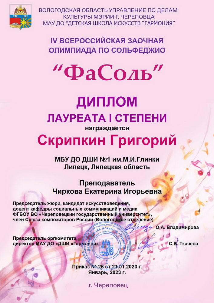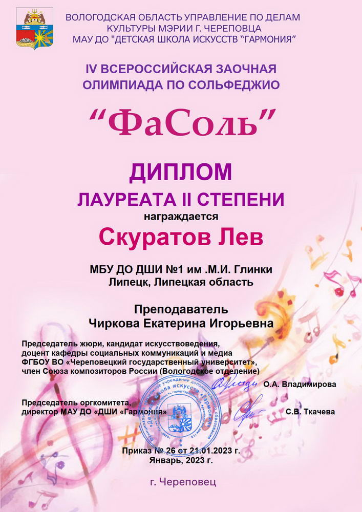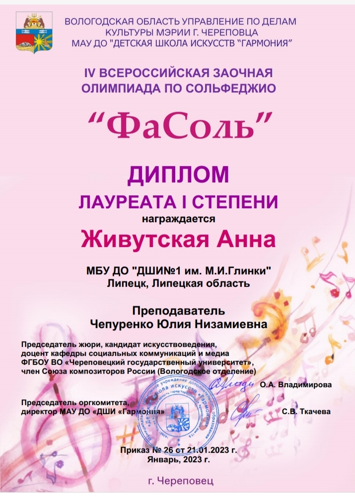 Поздравляем учащихся преподавателей теоретического отделения Чирковой Е.И. и Чепуренко Ю.Н. с успешным выступлением в IV Всероссийской заочной олимпиаде по сольфеджио «ФаСоль» г. Череповец.