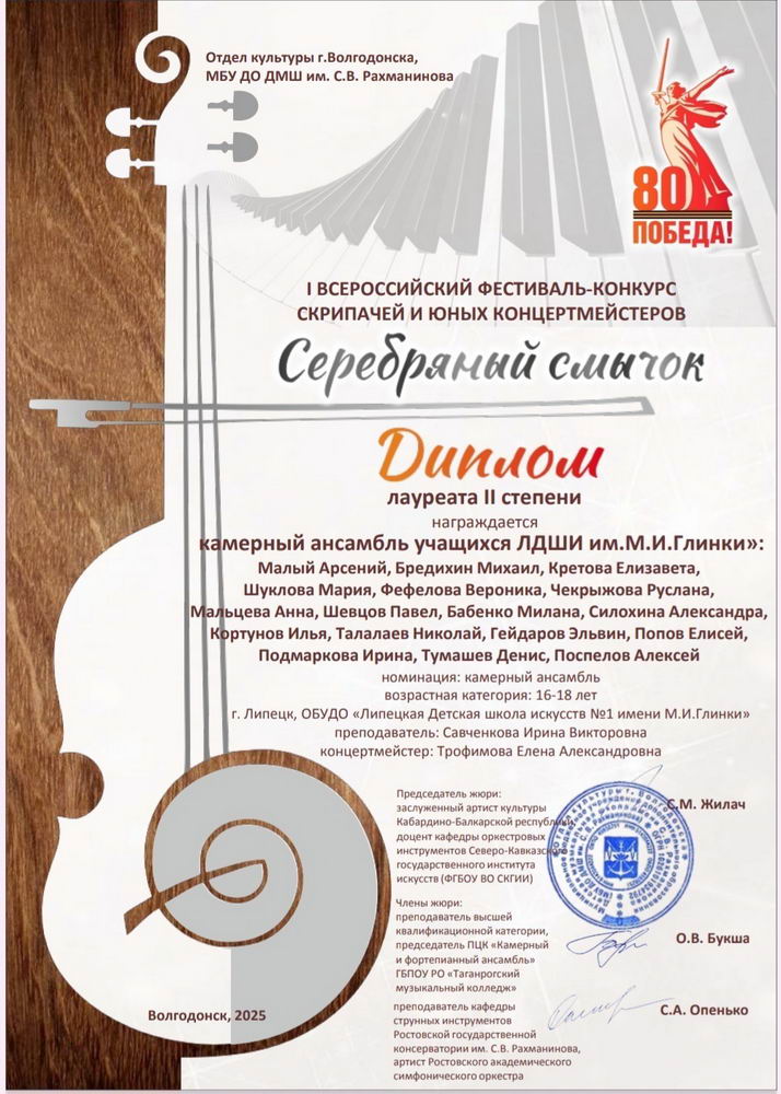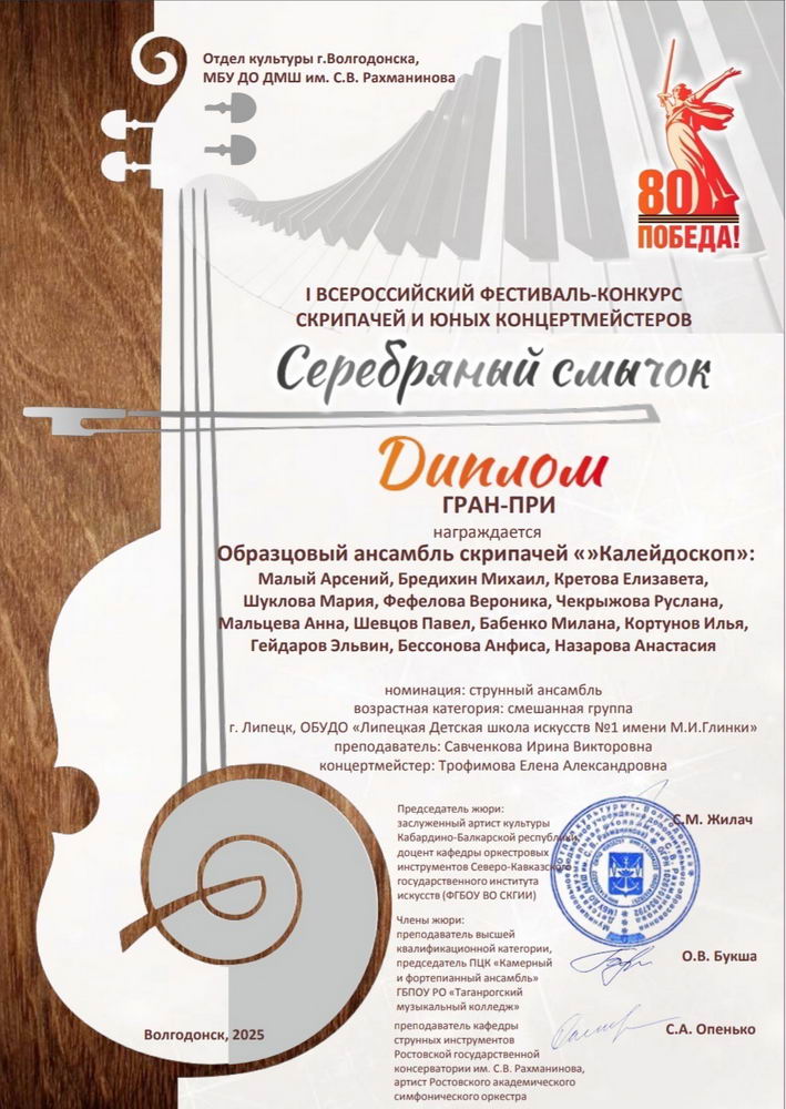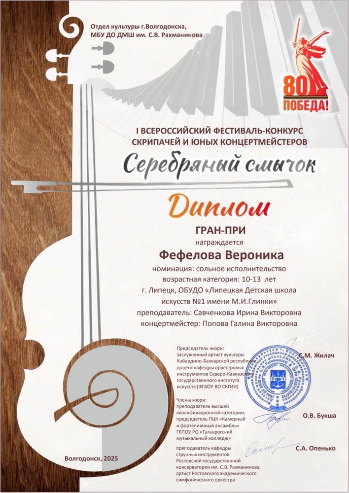 Триумфом закончилось участие учеников класса скрипки преподавателя "Липецкой ДШИ N1 имени М.И. Глинки" Ирины Викторовны Савченковой во Всероссийском фестивале-конкурсескрипачей и юных концертмейстеров «Серебряный смычок".