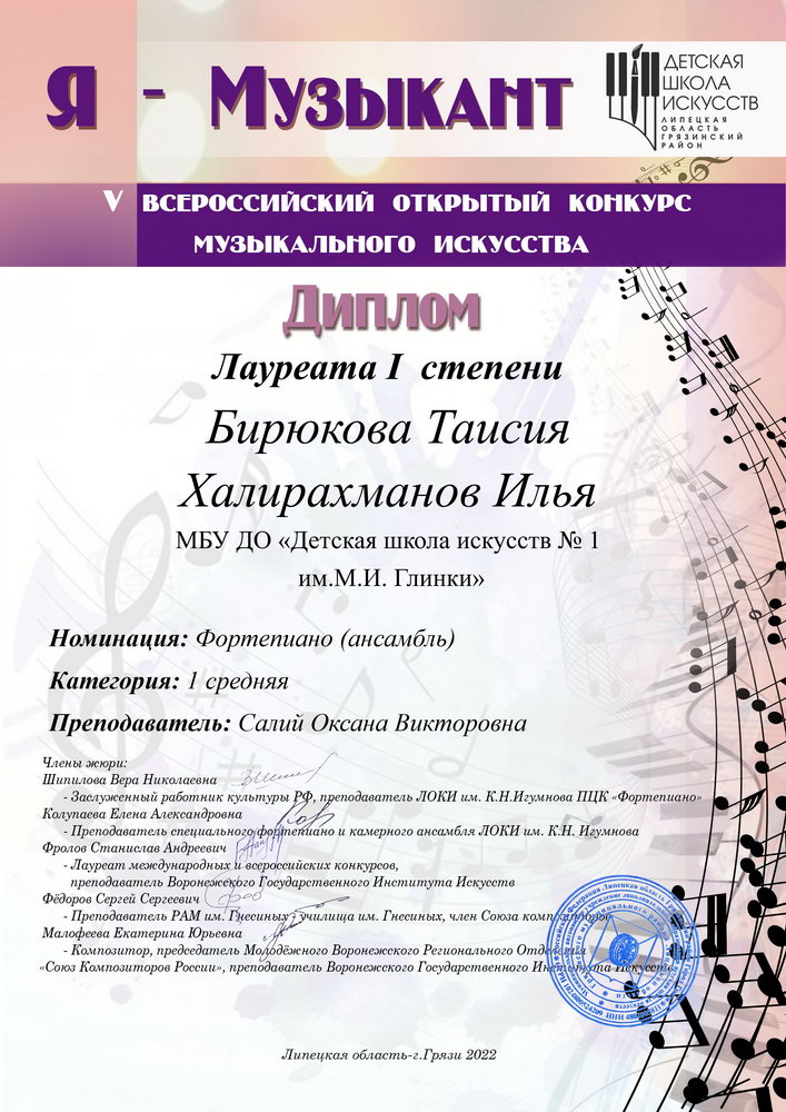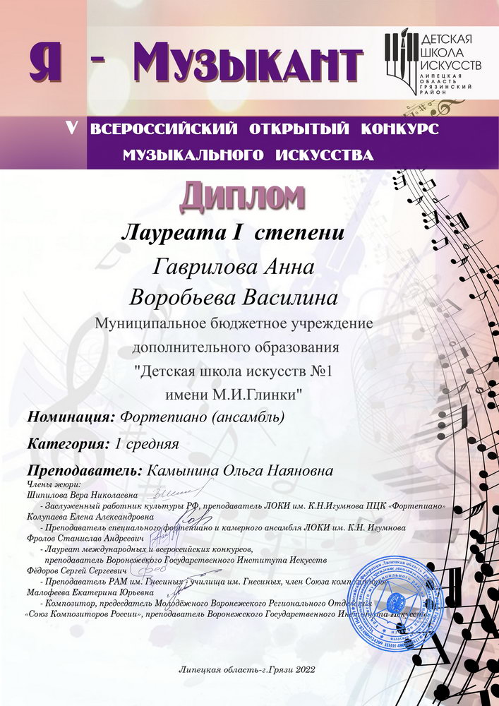 Поздравляем учащихся фортепианного отделения и педагога Павлик Н.В. с победой в V Всероссийском открытом конкурсе музыкального искусства «Я музыкант»!.