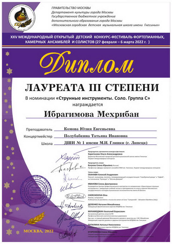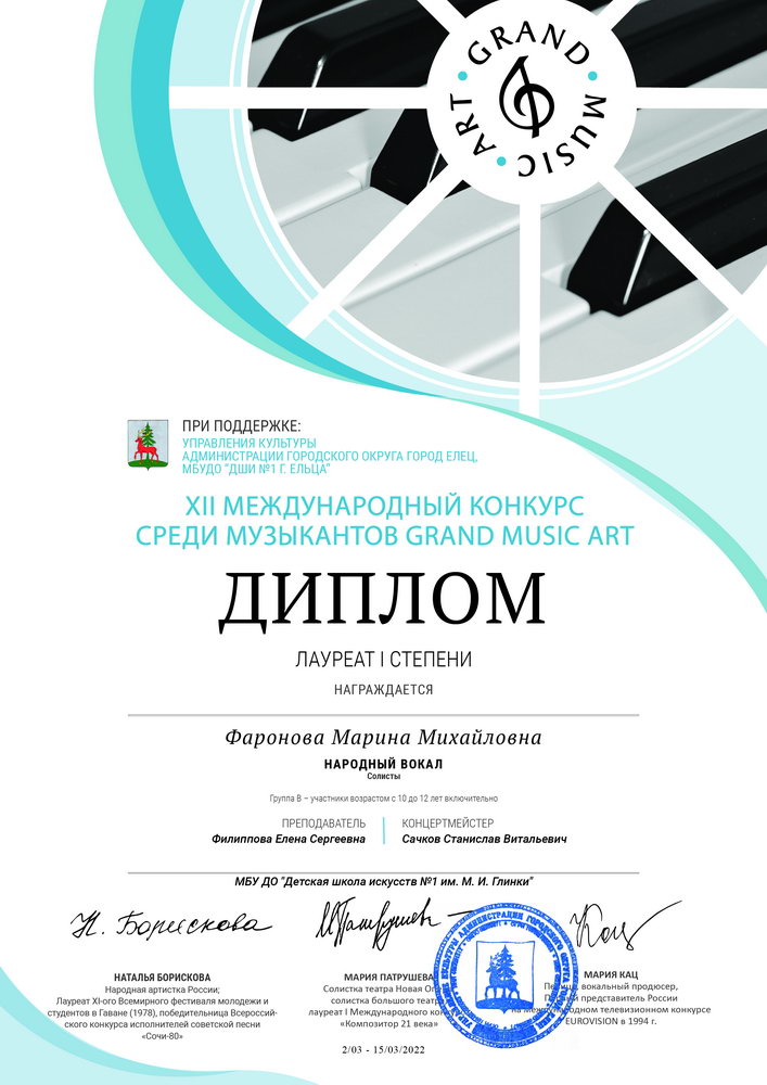 В марте учащиеся отделения Сольное пение и Струнно-смычкового отделения участвовали в нескольких статусных конкурсах и завоевали заслуженные награды! Поздравляем Бакай С.В., Комову Ю.Е., Волобуеву Г.И., Филиппову Е.С. и их учеников с победой!