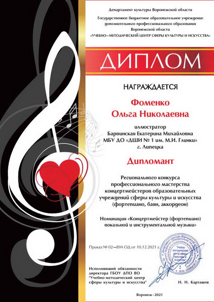 17.02.2022 г. в ДШИ № 6 в рамках областных курсов повышения квалификации реализации дополнительной профессиональной программы "Искусство концертмейстера" прошел мастер-класс Задонской Екатерины Михайловны, профессора кафедры камерного ансамбля и концертмейстерского мастерства Воронежского государственного института искусств, заслуженной артистки РФ (г.Воронеж)
