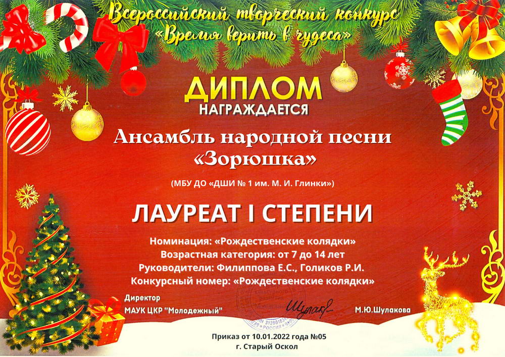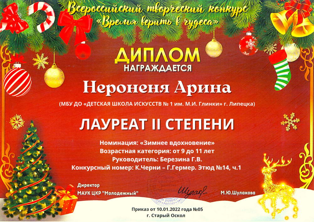 В начале января в городе Старый Оскол на базе Центра культурного развития «Молодежный» прошел Всероссийский творческий конкурс «Время верить в чудеса». Учащиеся нашей школы приняли в нем активное участие. Поздравляем учащихся отделения сольного пения, струнно-смычкового и фортепианного отделения и их преподавателей с победой!