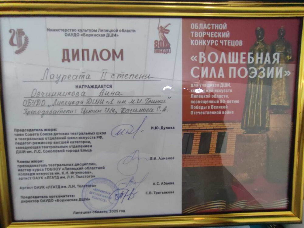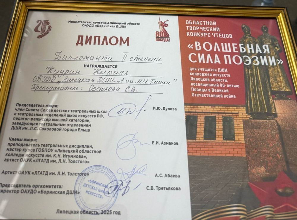 9 июня в Боринской ДШИ состоялся Областной творческий конкурс чтецов "Волшебная сила поэзии" для учащихся детских школ искусств Липецкой области. Конкурс был посвящён 80-летию Победы в Великой Отечественной войне и включал 2 номинации - художественное слово (проза) и художественное слово (поэзия).