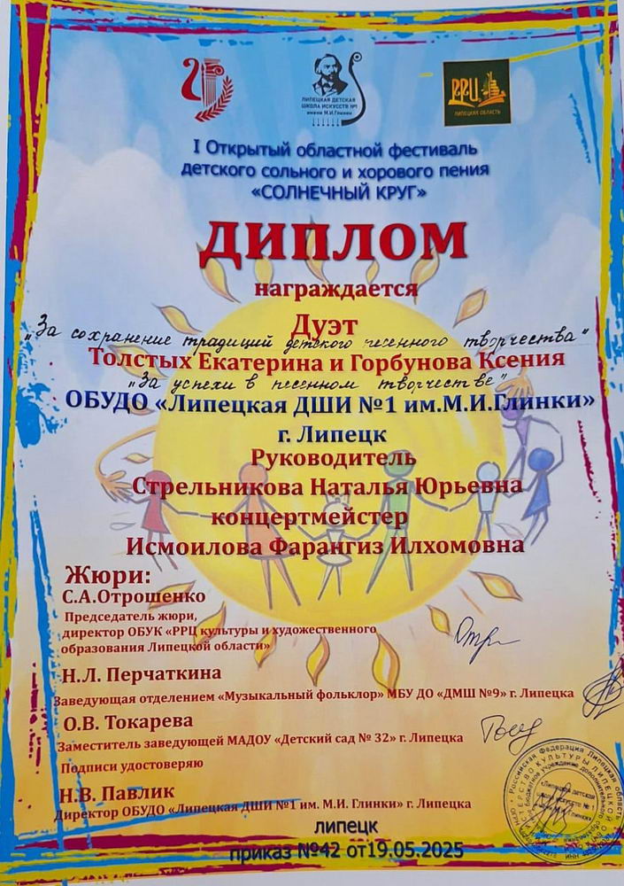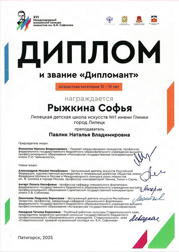 В этом году Липецкую ДШИ №1 имени М.И. Глинки представляла ученица 6 класса Софья Рыжкина (преподаватель Н.В. Павлик).
